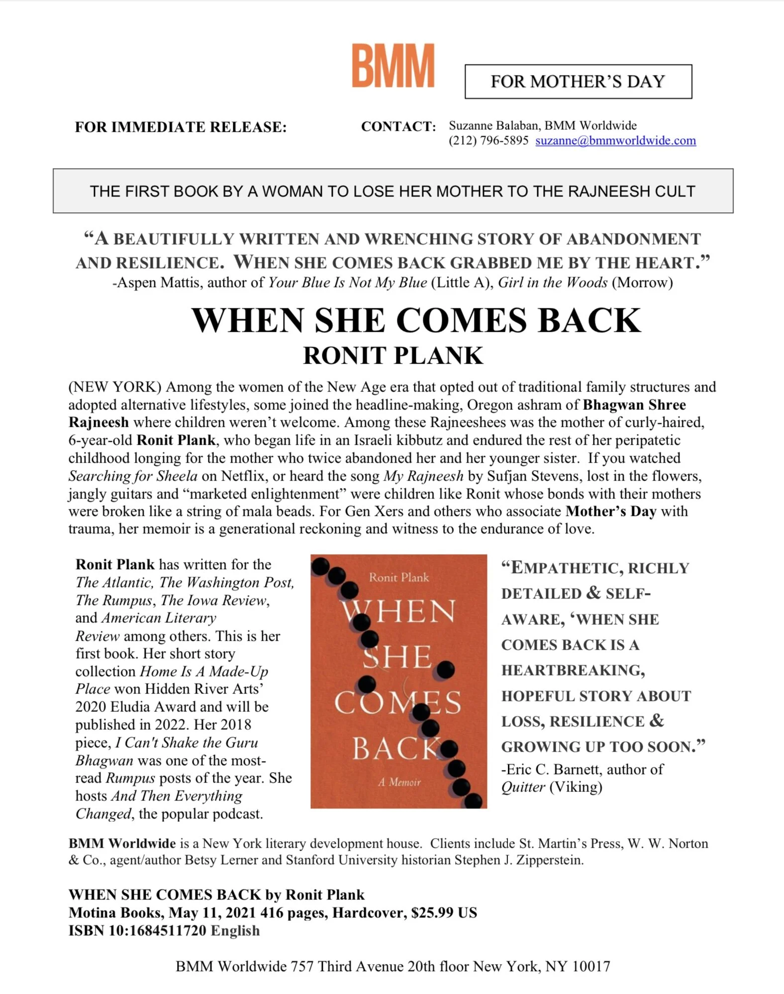 “In this fascinating coming-of-age memoir, Ronit Plank poignantly explores the resilience of a child longing for her mother and ultimately leads us along her path to reconciliation. When She Comes Back is a stunning debut.”
